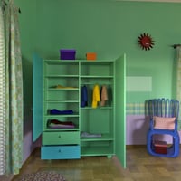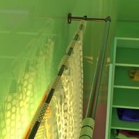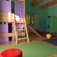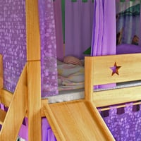 The loft bed with ladder and slide has a modular structure. All bed curtains can be provided with different fabric colors, fabric styles and fairytale motifs. The artist Snjezana Vidovic has provided 10 of her fairy-tale illustrations for the design of the curtains.