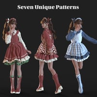 The dForce-enabled main dress showcases a high-waisted design, complete with delicate ruffles and a bow at the waist. The three-layered skirt flares gracefully, featuring a layered hem with intricate lace trim. Underneath the dress, the character wears a long-sleeve blouse adorned with a subtle print, high collar, and ruffled cuffs. The dress comes with various morphs, from adjusting the skirt length to fine-tuning details.