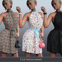dForce Pure Class Outfit for Genesis 9 includes: Dress, Bag zeroed Left and Right, Earrings, Bangles L & R. 5 Full texture presets.