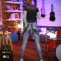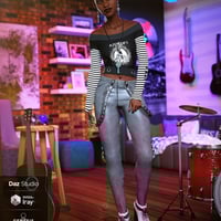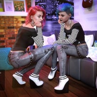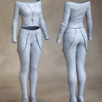 An outfit that any free-thinking, anti-conformist teen would be proud to wear... stylish pants, off the shoulder top, high heels and jewellery to match. The necklace can be dforced as well, adjust the rigid follow node pendant after simulation to suit the pose.