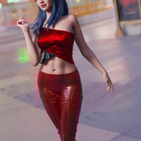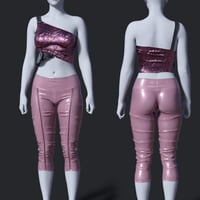 A dazzling party outfit featuring a shimmer top that catches the light with every move, paired with sleek tight pants. This combination is perfect for a night out, blending glamour with a touch of edginess.
