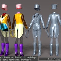 The outfit includes some hierarchical material presets for changing the look of the outfit. Also includes additional material and shader presets for changing parts of the outfit or selected surfaces.