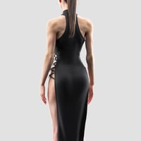 This high neck midi dress features lace details with revealing side cuts