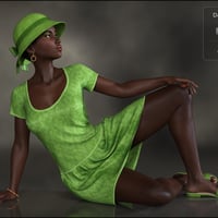 A delightful outfit for all your Genesis 8 female characters: a drop waist dress, comfortable sandals, and a cute cloche style hat. The dress has an HD morph for the trim detail to turn on after the drape but the base resolution is quite reasonable and simulates fast. It is fully rigged and does not need to be simulated at all if you don't want to. The hat is a prop on a rigid follow node so it will automatically fit your characters. The sandals and hat also have options for use as decoration props.