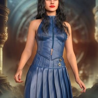 Unleash your inner warrior with our striking leather outfit, featuring a sleek zip-up top and a pleated skirt adorned with belts and decorative buckles.