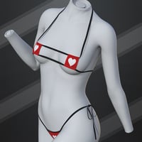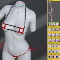 Contains 15 bikini top materials, 15 bikini bar materials, 5 bikini heart materials, 15 bikini shorts materials, 15 bikini panties materials, 5 bikini shorts heart materials, and 32 morphs, to ensure it works for all your renders.