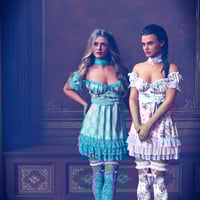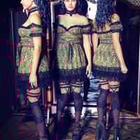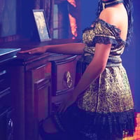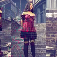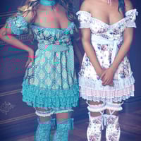 The babydoll dress has a voluminous skirt with lots of laces and puffed off the shoulders sleeves. The outfit has also a collar with lace trims, knee-high stockings with bows, lacy panties, and extravagant shoes.