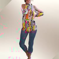 This stylish and versatile outfit includes a vibrant, patterned shirt with open shoulder detailing, slim-fit capri jeans, and accessorized options such as heels with anklets, a dainty necklace, and intricate earrings.