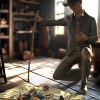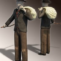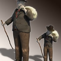 Creating an outfit for a Genesis 9 character inspired by a 1950s traveling merchant who travels from town to town in Ireland sells small goods such as clothes pegs and hair clips and also brings local news from house to house, This outfit captures the charm of that era along with the practicality of a traveling vendor. It comes with 2 texture sets, dirty and clean, a Hat, Jacket, Belt, Pants, Shoes, Stick, a sheet on the back, and a Sheet in the ground with small goods.