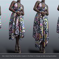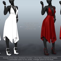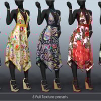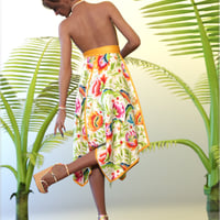 dForce Tropical Vibes Outfit for Genesis 9 includes Dress, Necklace, Shoes, Bracelets Left and Right. 5 Full texture presets. 2 customizable fabric options for the dress and the shoes. Customizable option for the jewelry.