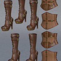 Five texture options are provided, with presets that allow you to mix and match. Texture presets to hide different parts of the corset, boots, and neckband give you even more versatility. A plain white texture version, with no maps in the base color channel, has normal and bump maps for leather, metal, and cloth so that you can input your own colors or textures for a truly unique look.