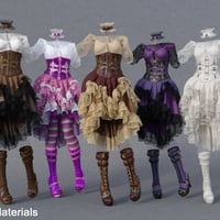Included are: 2 blouses (one that is loose, meant to be worn without a corset, and one that is tight to the body), a long asymmetrical skirt, a short asymmetrical skirt (bustle), leather corset and boots, panties, stockings, and a neckband.