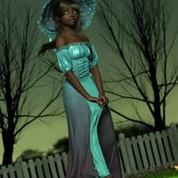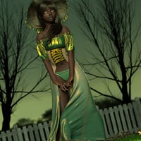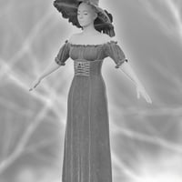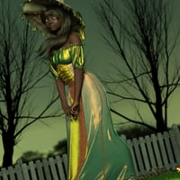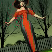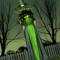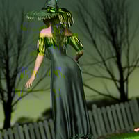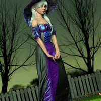 A cute witch ensemble with dress, hat and shoes. Six material choices for each item is included.