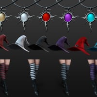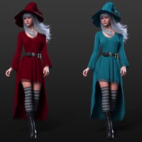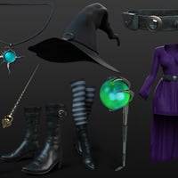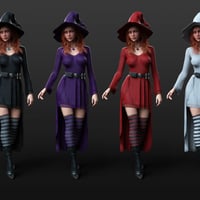 This set includes a dress, necklace, witch hat, boots, stockings, a magical belt with the pouch and potions, as well as multiple material options for the dress, hat, necklace, and stockings, to complement your fantasy scenes.