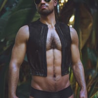 A tight shirt with sleeveless jacket, fitting both male and female.