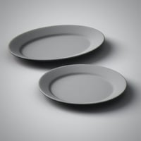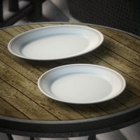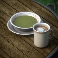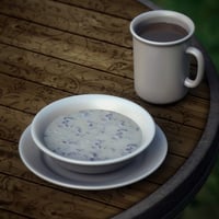 The dishes are the plain, heavy pottery dishes used in diners. The set includes a large oval plate, a regular plate, a small plate for bread, salad, or desserts, a bowl, and a mug. All dishes have two materials: bone white and cream with tan stripes. In addition, the bowl has three material presets for soup: mushroom, tomato, and split pea. The mug has three presets for contents: black coffee, coffee with cream, and hot chocolate.