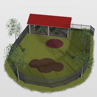 Dog Park, featuring fence with rigged gate and latch, water fountains, play areas, doggie themes garbage or other waste receptacles, human/canine combo water fountain, pavilion, picnic tables, tree and landmass with grass. Tree and landmass are build with transparency based blending allowing them to smoothing blend over most flat surfaces or HDRI's with ground turned on. Strand based grass is included for a full looking ground.