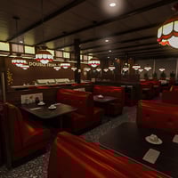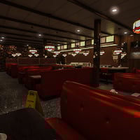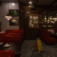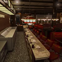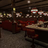 All the little details from this diner will make you feel like you are in an era where townspeople dress up just to go to a diner. This diner looks a little spooky, but distinctly fancy, with a subtly dark mood.