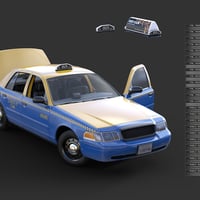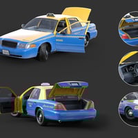 This pack has plenty to offer. It includes 5 material designs and a fully functional rig with controls, providing a wide range of versatility for your renders. You can change the roof sign and have full control over the wheels, the doors, the windows, the trunk door, the suspension; please see below the full list of features.
