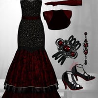Add lace, sparkle and bling to the Evening Gown for Genesis 2 Female(s), a premiere 3D model, with these two gorgeous 3D styles. Choose the silver or the black-and-scarlet style; each come complete with coordinated accessories.