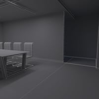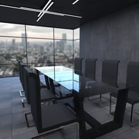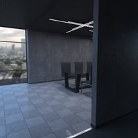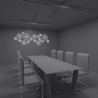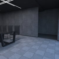 Dystopian Dining Room features a detailed sci fi minimalist theme interior scene with chairs, tables, wall decor, and unique ceiling lights, Optimized for Studio with Iray.