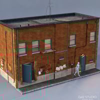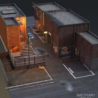 EArkham's ZWorld Secret Alley includes one large alleyway with three integrated multipart buildings, two multipart standalone buildings, as well as over 30 assorted back street themed props and assets such as utility poles, lights, garbage bins, dumpsters, conduits and fire escapes. All buildings have simple interiors with opening doors, and two sets of utility poles have cables and are rigged, and the bins and dumpsters can open.