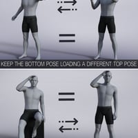 When you load a lower pose, you are NOT going to lose the upper pose or expression previously loaded, and vice versa, if you load an upper pose, you are NOT going to lose the lower pose and the face expression (if you have). This lets you save time adjusting just small details depending of the combination used, additionally gives you the chance to try different possibilities to get vastly a new pose, without wasting time to adjust your character to the floor or begin a pose from zero.