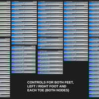 There are controls for the entire left foot and right foot, both feet, all toes (left and right foot) separately (toe node one and two) or together, the heel and metatarsals. Included are also custom morphs to adjust the feet and for the nail length (each nail separately or all together).