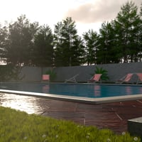 Recreational pool surrounded by beautiful vegetation, with a small two-level building.
