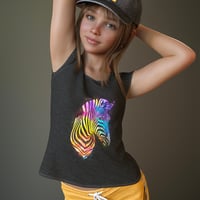 Eden's clothing is a casual and sporty outfit that reflects her playful and active nature. She has on a black t-shirt with a vibrant, multicolored zebra graphic on the front.