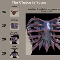 The breastplate has a little trick: it consists of two parts. The Inner Part and the Outer Part. When (or if) you turn the Inner Part off, the reduced amount of protection is well compensated by the increased confusion on the battlefield. In addition, the six spikes in the front are adjustable. They can be moved up or down if there is a need to cover the nipples of your heroine.