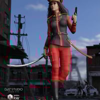 El Comandante is a conforming officer outfit for Genesis 3 Female(s) that comes in 4 parts: Jacket, Pants, Belt and Boots, and 4 wearable props: Cap, Sword, Pistol and small Staff with a Hidden Dagger.