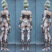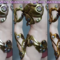 The set includes 11 independent pieces: a bra/chest piece, a metal hips piece with leather panties, neck, arms, forearms, thighs, and shins ornaments.