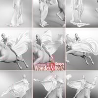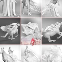 "Equine Dreams" is a combination of 15 carefully handcrafted, womanly artistic poses for Victoria 7 and matching poses for DAZ Horse 2 and 15 very high-res morphing Equine Dreams WonderSheetZ props which are made mostly with wind force and/or low gravity to get a light and "foldy" look. Every Victoria7 / DAZ Horse 2 pose has it's own designed Equine Dreams WonderSheetZ prop with three to six different drapes each, all in all 93 different drapes.