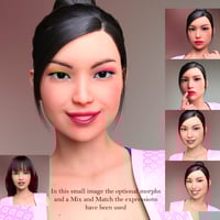 Her features more Asian and her nine makeups are combinable with nine lips, 6 eyeliner, and 6 eyeliner color and with six colors of eyelashes, which make them can be seen in many different ways.