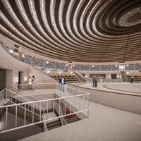 A complete building environment, both inside and out, with a reception area downstairs and amphitheater upstairs.