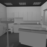 This set is completely modular, each wall, the floor, and the ceiling being an independent prop. There are cabinets (both wall and floor models), a trash can, a set of blinds, and wall mounted paper towel dispenser, and magazine rack.