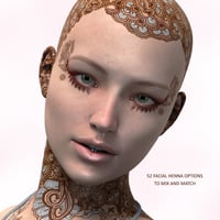 A Layered Image Editor Preset to add realistic Henna, makeup and binidi spots to any Genesis 2 Female character in your Runtime. Included are presets for 3 Henna Strengths with additional options to add gold, silver and red leaf detailing over the top of the Henna details.