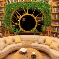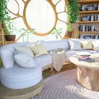 It includes a stylish round wooden window, a large sofa set, bookshelves, and other living room props in the scene. All are ready to render in Iray.