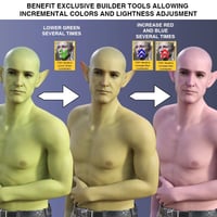 Adjust everything with the included Builder Tools! The figure is too dark? Is it too blue? Not enough green? Play with the incremental builder tools to increase the lightness, reduce the blue, increase the green, etc, of your current skin. They will iteratively adjust the lightness and the color of your figure to your taste.