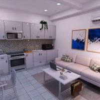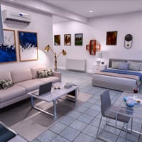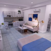 A bright white studio apartment with large windows and a spacious kitchen offers an open and airy living space flooded with natural light.