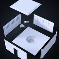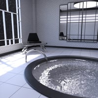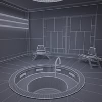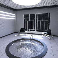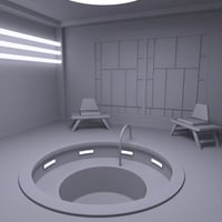 Sci-Fi Hot Tub Room is a sleek utopian futuristic interior with a jacuzzi, chairs, sliding door, wall mirror, and cameras, that load as a full scene Preload.