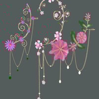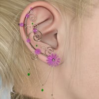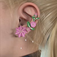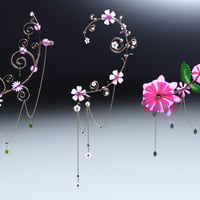 A nice set of three whimsical earcuffs in floral themes. Detailed pieces built carefully with gold, pearls, gems and translucent flowers.