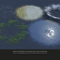 - The grass and rocks are instanced to save on resources. If you have UltraScatter you can turn the instancing preview on and off.