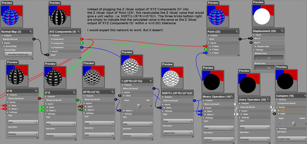 I've just discovered an even simpler demonstration of the problem - take the 'Z Component' output of the 'XYZ Components' brick, multiply it by itself, take the square root (so you should end up with the same value as the 'Z Component' that you started with) and plug that into the 'Z Value' input of the point brick.