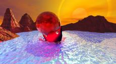 Pure Bryce; four objects, three colours, four lights, no atmosphere or sun. Camera FOV 180 º. Only postwork is transform from TIFF (as exported) to JPG.
