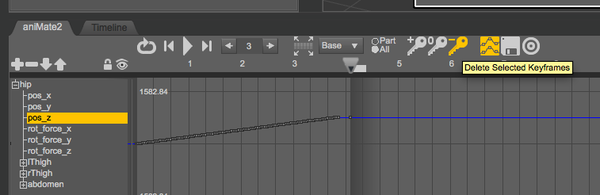 Click the pos_z on the hip, then click the - key icon, and delete all keyframes in the block that way.