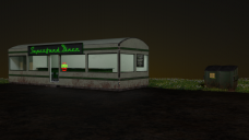 I used it to place the grass and weeds over the ground plane for my diner set, as shown in the renders below. In Blender I used Grass Free to make 1m-circle bunches of grass (Bahia for north of the road, taller wild Rye for around the swamp to the south) and weeds (clover, crabgrass, and dandelions, to be scattered both north and south of the road). Grass Free uses very low-poly models, so they don't use much memory.