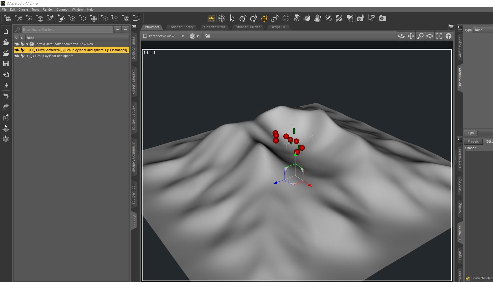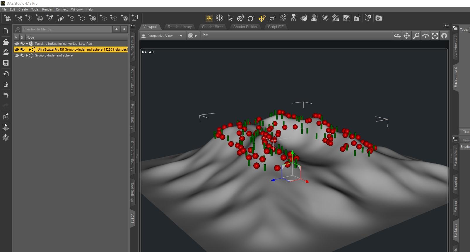 So here are three very simple proof of concept tests customizing a terrain and controlling distribution of primitives on it with UltraScatter.
