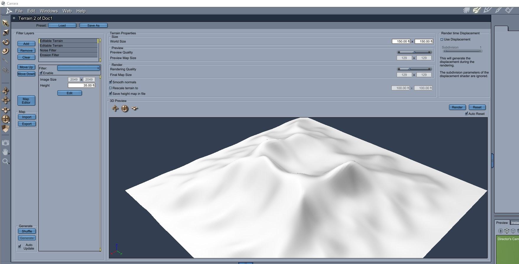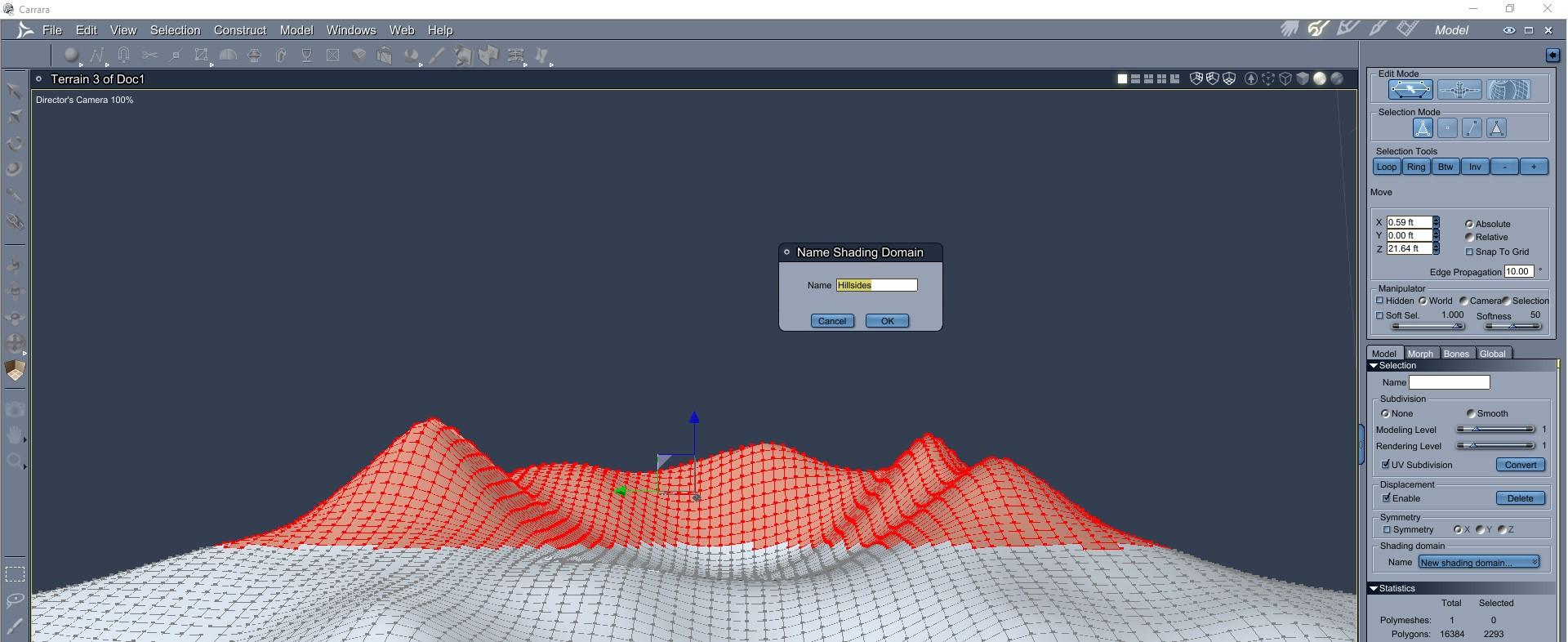 At the proof of concept stage for myself.  Having encouraging early success creating sample terrain objects, material zones, and maps to control distribution.  In the following, I used the Carrara terrain modeler to create the hill and plateau, then within Carrara I converted it to an obj.  I used Carrara's vertex modeler to create material zones and further edit the terrain shape.  I used Carrara's 3D Paint tool to paint distribution maps directly on the model.